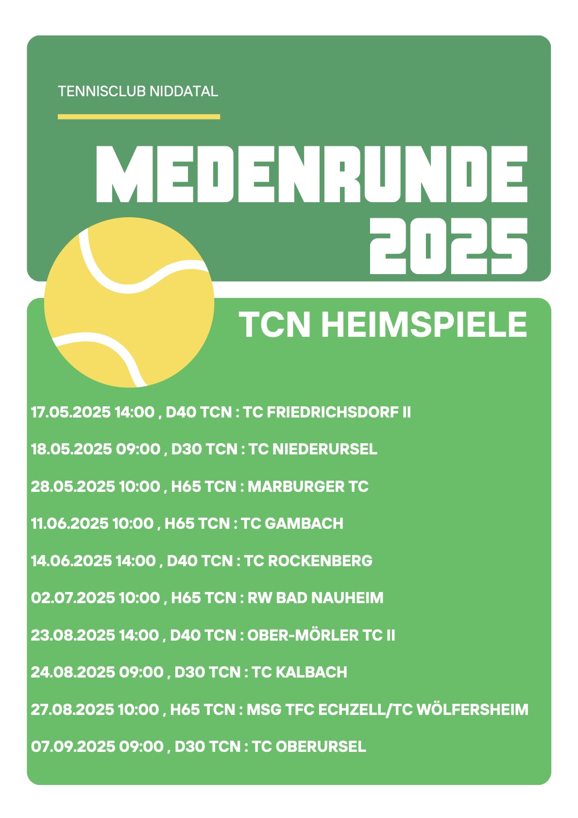 Seit vielen Jahren nimmt der TC-Niddatal aktiv und erfolgreich an den Medenspielrunden teil. Wir stellen aktuell Damen- und Herrenmannschaften.