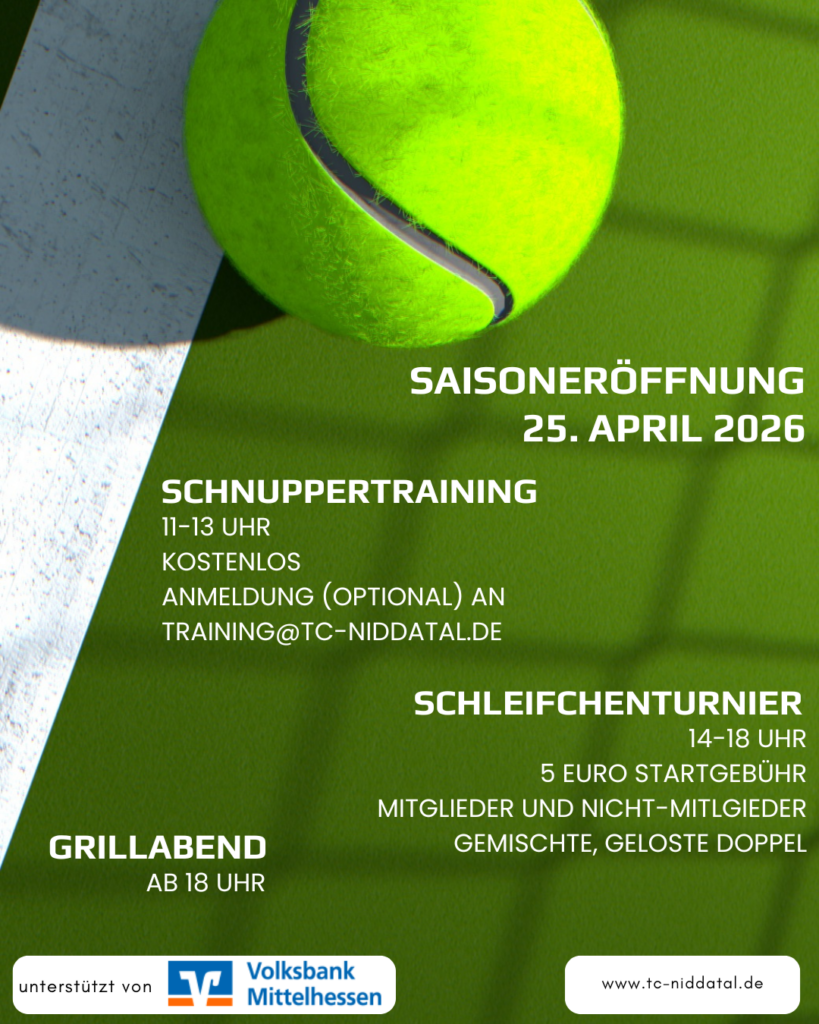 Los geht’s von 11 bis 13 Uhr mit einem kostenlosen Schnuppertraining für alle Altersklassen — perfekt für alle, die Tennis einfach mal ausprobieren möchten. Eine Anmeldung ist per E-Mail an training@tc-niddatal.de möglich, spontane Teilnehmerinnen und Teilnehmer sind aber ebenfalls herzlich willkommen.