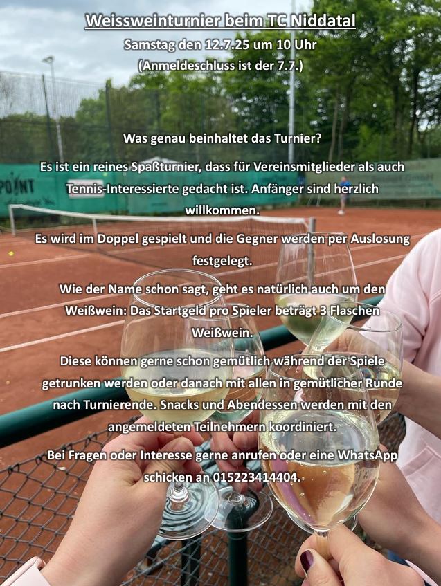 Eine Anmeldung ist nicht erforderlich. Wir freuen uns auf viele Teilnehmer! Bei Fragen bitte per E-Mail an vorstand@tc-niddatal.de wenden.